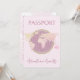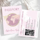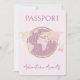 Travel-themed Passport Baby Shower Invitation for baby girl featuring pastel pink background, gold-accented globe illustration, and customisable event details.