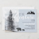 Adventure awaits, rustic woodlands bear baby shower invitation in soft pastel grey blue hues, with a majestic forest pine tree and mountain silhouette. Personalise for your baby shower.