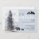 Adventure awaits, rustic woodlands bears baby shower invitation in soft pastel grey blue hues, with a majestic forest pine tree and mountain silhouette. Personalise for your baby shower.