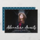 Trendy graduation announcements featuring the graduate's horizontal photo with "Adventure Awaits" in white handwritten script lettering. Personalise the front of the Adventure Awaits graduation announcements by adding the graduate's name, school name, and graduation year. The announcement reverses to display an elegant dark blue and white trellis pattern.