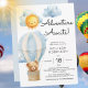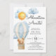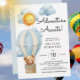 This charming baby boy shower invitation features a watercolor design with soft colours and a cute vibe, ideal for celebrating the arrival of a little one. The centerpiece of the invitation is a stuffed teddy bear on an air balloon, symbolising the adventure that awaits.