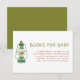 The LINDEN adventure baby shower books for baby card design has rustic font and a camping lantern.