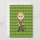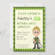 Birthday print invites with an illustration of a child adventurer, on a green diamond background. Illustrated by Maxi Harmony