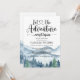 Let the adventure continue themed watercolor baby shower invitation with forest and mountains wilderness landscape with calligraphy script typography with heart in the middle.