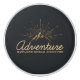 with a gold coloured illustration on a black-grey background. Designed with an illustration of a mountain with the suns rays shining outward from behind. Typography says: Adventure explore dream discover.