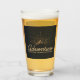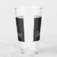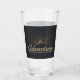 Drinking glass with a gold coloured illustration on a black-grey background. Designed with an illustration of a mountain with the suns rays shining outward from behind. Typography says: Adventure explore dream discover.