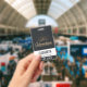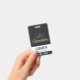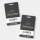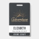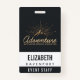 Personalised name badge with a gold coloured illustration on a black-grey background. Designed with an illustration of a mountain with the suns rays shining outward from behind. Typography says: Adventure explore dream discover.
