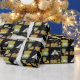 Maps, backpack, hiking boots, tent and more.  Fun wrapping paper features a variety of things needed to adventure into the Great Outdoors