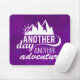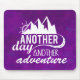 A mouse pad with an optimistic adventure quote which says: Another day another adventure. An image with the sun peeking out from behind some mountains. Set on a purple background.