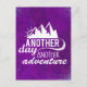 A postcard with an inspirational quote which says: Another day another adventure. An image with the sun peeking out from behind some mountains. Set on a purple background.