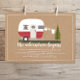 Adventure themed neutral baby shower with illustration of red and white retro vintage camper trailer with baby clothes hanging on clothesline connected to evergreen tree. Background is brown card stock inspired.