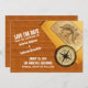 Adventure Wedding Save the Date Announcement featuring an antique compass, a stegosaurus dinosaur skeleton information plate on a piece of paper and a wood look digital art background. This cool save the date invitation is perfect for the archaeology, adventure, or museum enthusiast couple. Easy to customise, simply add your wedding details. Click "Customise It" to find more personalisation options.