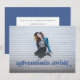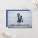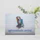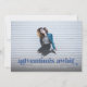This full bleed photo graduation announcement and invitation features the words "adventures await" in blue. It has space for your graduate's details on the front with even more room for text on the back of the card.