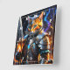 A cat dressed in shining armour stands confidently, wielding a sword, surrounded by mystical flames and glowing elements. The setting suggests a fantasy world.