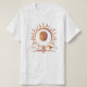 The T-shirt showcases a striking orange motorcycle helmet at its center, encircled by a radiant sun with flowing rays. Below the helmet, a rider on a motorcycle is depicted, set against a backdrop of rugged mountains. The entire design is rendered in a cohesive orange and white color scheme, creating a visually impactful and adventurous aesthetic.