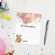 For a Baby Shower. A stylish white background. Decorated with rose gold, drips, paint dripping look, party streamers, balloons and a cute teddy bear.