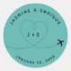 This destination wedding envelope seal has a plane and a heart shaped trail around the bride and grooms name and initials on an aqua background. This design coordinates with the other products in the Cabo San Lucas • El Arco Destination Wedding Collection.
