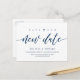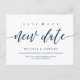 This is the modern aesthetic design themed, in  Navy Blue font, Wedding party invitation Rescheduled (postponed / postponement) postcard (Save our new date) . It is the perfect and elegant way to make the invitation reschedule announcement to your friends and family.