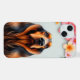 Beautifully detailed portrait of a dog, probably an illustration of a hound breed, positioned centrally against a light background. Its fur is long and flowing, predominantly in shades of brown and black. Surrounding the dog is a vibrant floral arrangement, consisting of various flowers in soft pinks, yellows, and whites, along with green leaves. The flowers create a cheerful and colourful frame around the dog, enhancing the overall aesthetic of the image. The composition has a whimsical and artistic feel, conveying a sense of warmth and affection.