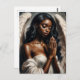 This classic oil painting style artwork features a black woman angel with eyes closed and palms together in prayer position. She has long, wavy dark hair and rich brown skin. The angel figure is wearing a draped white dress and has large white wings with feathers. Melanin angelcore portrait with an African diaspora appearance (African American, Caribbean, Afro-Brit, etc.).