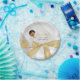 Beautiful vintage baby in christening suit wearing gold cross necklace and cross embellished hat on a white satin background with gold ribbon.