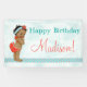 Adorable vintage baby in a red bathing suit with flower headband. Aqua watercolor background and flowered ribbon with lace trim. Perfect for children's birthday party, pool party, baby shower or baby announcement.