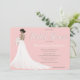 Bridal shower invitation features gorgeous African American bride in white wedding gown and pink and white rose floral pattern on back.