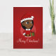 A Christmas card with an illustration of a cute smiling African American girl with long black hair, the girl is wearing a Santa Clause costume with a red hat and holding a present.