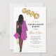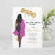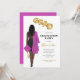 African American female pink Graduation Party Invitation woman portrait drawing black dress, pink cap and gown, long dark hair. The letters GRAD in faux gold foil style balloons. Personalise with graduation party details, and the graduate's class year and school name. Please message me for matching items.