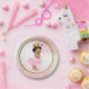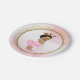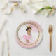 Princess baby shower paper plates with adorable princess baby girl wearing a pretty pink tutu and string of pearls and gold crown on a beautiful pink and gold background. These cute princess baby shower paper plates are easily customised with text.