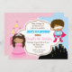 Cute split invitation for twins / siblings, in dual / duo theme: princess & superhero with african american boy & girl.