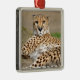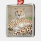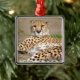 Closeup African Cheetah (Acinonyx jubatus) lying on ground, the head raised looking at the photographer