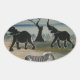 This artwork portrays a harmonious scene set within a circular frame, reminiscent of a medallion or cameo. The elephants are depicted trumpeting, suggesting a joyful return or a call, while the zebra stands watchfully in the foreground, adding depth to the composition.
