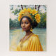 Puzzle features classic oil painting style portrait of regal, brown-skinned orisha, Oshun (aka Osun) - river goddess of divinity, femininity, fertility, beauty, and love. The African goddess is wearing a gold crown, yellow floral headdress, gold jewellery, and an elegant golden yellow dress with nature background featuring a body of water. A melanin royalcore aesthetic with a divine beauty and African deity.