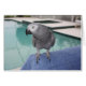 Congo African Grey parrot standing on her blue towel poolside and enjoying the sun! Pretty scalloped grey feathers against a background of aqua green and blue. Perfect for the bird lover in you!
