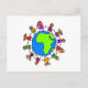 Cute and diverse happy kids holding hands around a globe featuring the map of Africa.