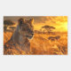 A digital rendering of an African lioness in the golden grass of the savanna at sunset.