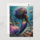 This postcard features artwork of a dark-skinned mermaid with an iridescent purple and blue tail. She has purple hair adorned with an elaborate headpiece as she poses for this undersea portrait, surrounded by fish and other sea creatures. A vibrant, colourful melanin mermaid-core painting.
