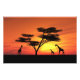This image shows an idyllic sunset with giraffe and umbrella acacia