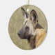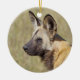 Porcelain holiday ornament showing a close-up head and shoulders photo of an African Wild Dog. This dog was part of a pack of at least 20 dogs which we observed near Savuti Camp in the Okavango Delta, Botswana in July 2012.