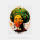 My Design features a stylised portrait of a Beautiful African woman wearing a colourful headwrap. The headwrap is adorned with green and yellow leaf patterns. Her face is filled with a sunset silhouette, complete with birds flying across the sky and a landscape with trees. She wears large, ornate earrings and a beaded necklace. Original Pop Art Style Vector Illustration Copyright BluedarkArt TheChameleonArt.