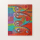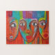 This custom puzzle features a contemporary oil painting of three African women's faces vibrantly painted in colorful brush textures.