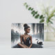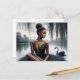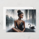 This ballet-themed postcard features artwork of a dark-skinned ballerina sitting in front of a lake, under a willow tree. A black swan is swimming on the body of water behind her. The painting has a moody feel with its greyscale colour scheme, save for the pop of rich brown skin on the elegant, poised ballet dancer. She is looking off to the side as she poses for this dark nature portrait.