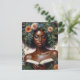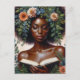 Celebrate beauty, intellect, and nature in a fine art postcard featuring a melanin-rich woman peacefully immersed in a book. Framed by lush botanical greenery and soft peach and cream florals woven into her voluminous afro, this artwork radiates calm confidence, natural hair pride, and quiet strength.