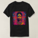 The T-shirt design features a goddess-like figure adorned with intricate jewellery and a radiant headpiece. Her face is painted in vibrant neon colours, blending shades of yellow, pink, and blue. The abstract background swirls with bold hues, creating an energetic, mystical atmosphere, evoking power, elegance, and divinity.