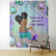 Afro Mermaid baby shower backdrop with adorable African American mermaid with cute afro hair on a beautiful jewel background. This African American mermaid baby shower banner banner is easily customised for your event by simply adding your text in the font style and colour you prefer. You can also choose the size.