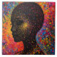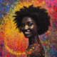 Afro Nebula Whisper – Black History Celebration. This artwork masterfully captures the essence of an Afro-descendant woman's profile, her silhouette a profound black void punctuated by a mesmerising array of multi-coloured dots that mimic stars in a vibrant nebula. The background explodes in a symphony of reds, oranges, yellows, greens, blues, and pinks, symbolising the infinite universe within every individual of colour. During Black History Month, this piece serves as a powerful reminder of the diverse artistic heritage gifted to the world by peoples of African descent - from the rhythmic patterns of Kente cloth to the innovative expressions in contemporary Afro-futurism.