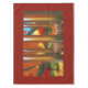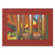 After the wind a single fallen leaf lies where it fell on a silent wind chime. On the ground beneath the still-green grass is covered with yellow and red leaves. In the background a crimson and gold autumn orchard reflects its colours in the silver bars of the chime.