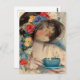 Lovely young lady with colorful flowers on her hat drinking a nice cup of afternoon tea. Vintage Art Deco watercolor illustration by Harrison Fisher (1925).