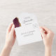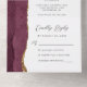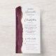 The left-hand edge of this elegant modern all-in-one wedding invitation and RSVP features a burgundy red watercolor agate border trimmed with faux gold glitter. The customisable text combines stylish charcoal grey calligraphy script and sans serif fonts on a white background. The return address appears on the outside flap and the reverse side of the detachable RSVP card in charcoal grey text on solid white.